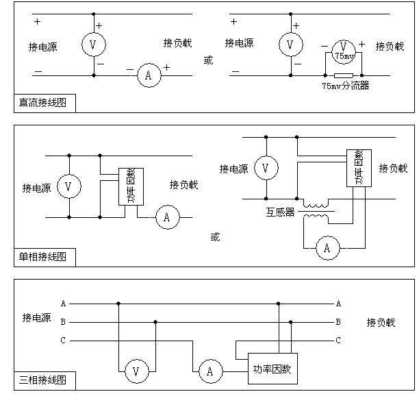 當采集“三相”電參數(shù)時,電壓傳感器輸入端連接至Uab;電流傳感器輸入端連接至Ic;功率因數(shù)傳感器輸入端連接至Uab、Ic??刹捎没ジ衅鲾U大電流量程,互感器的連接方法同單相接線圖的互感器部分。