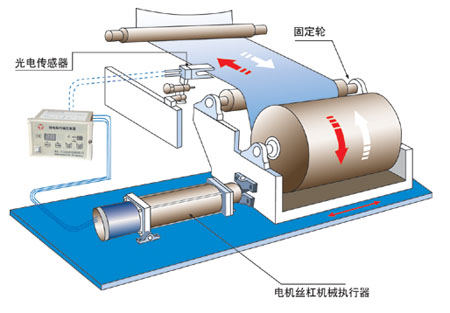 光電傳感器或氣敏探頭安裝在與卷取車臺共同移動的位置上,經(jīng)電機絲杠或液壓缸驅(qū)動修正,使所卷之材料相對傳感器或探頭不偏不倚,使所收之卷整齊。